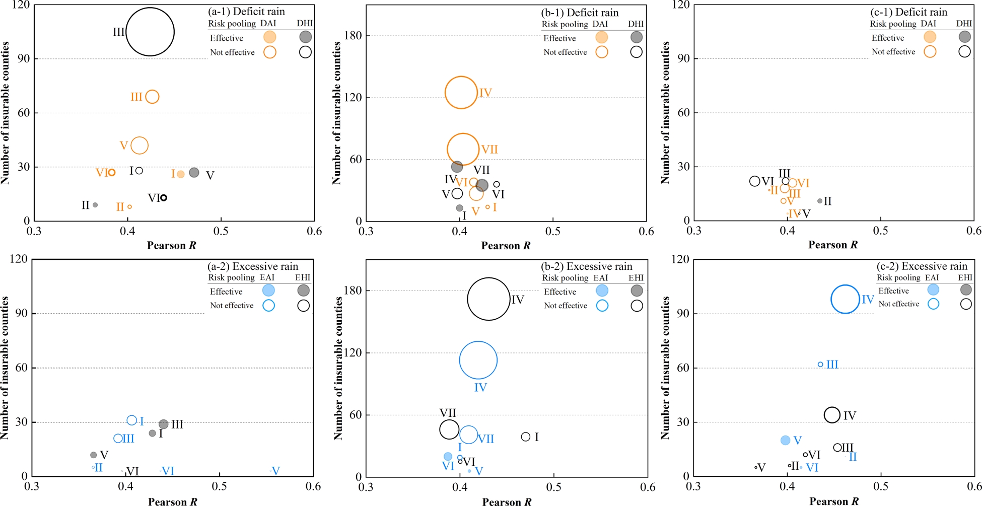 研究表明,对于大部分粮食作物主产区,降雨天气指数保险在应用过程中均会面临:可保县市相对较少、相关系数普遍较低、产量损失难以独立的和损失风险无法有效池化等挑战;这样的结果主要是由于自然环境中农业气象灾害波及面广且局部气候多变造成;同时这也意味着采用跨区域、跨作物甚至跨灾种等方式来分散产量损失风险、提高天气指数保险可行性的研究应用势在必行。