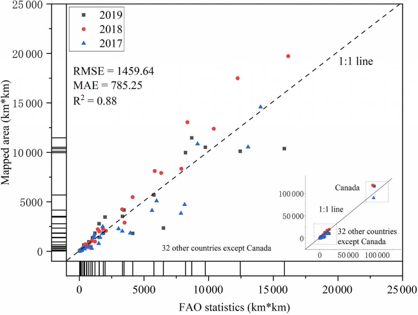 将识别出的油菜籽面积与联合国粮食及农业组织的统计数据做对比,两者具有较好的线性关系。