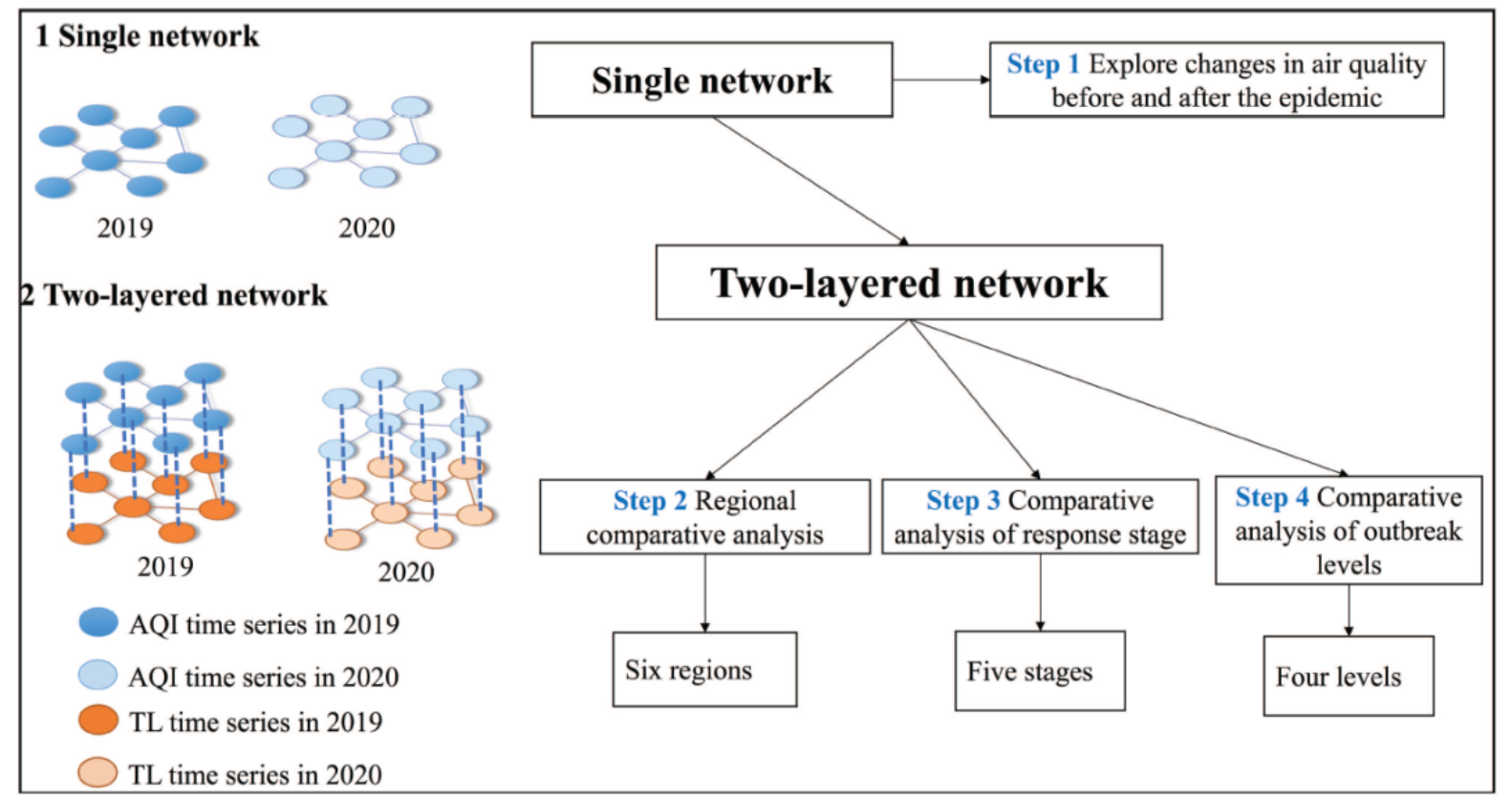 为了解决这些问题,作者转向加权气候网络框架,使用 2019 年的大流行前数据和2020年的数据将每个城市建模为一个节点,最终构建了一个包含不同区域、疫情应对阶段和爆发级别的两层网络。