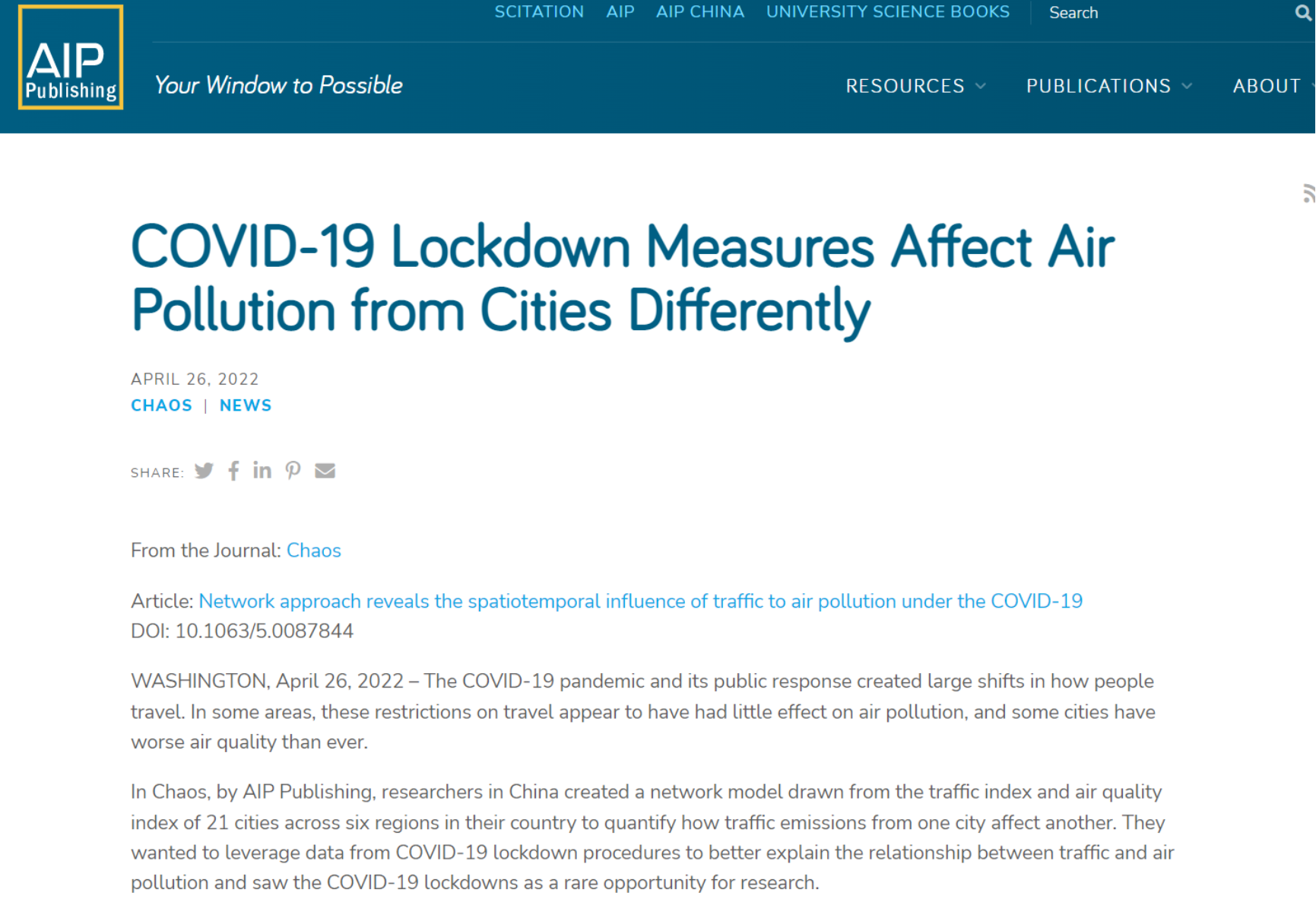 美国物理联合会AIP官网报道betway88西汉姆联汪伟平、杨赛霓和系统科学学院樊京芳等对COVID-19 封锁措施对城市空气污染的影响研究的新进展。随着冠状病毒(COVID-19)大流行席卷全球,许多国家实施了严格的封锁政策以阻止疾病的传播。这些政策减少了人类的流动性,特别是限制了交通活动,本应改善环境空气质量。然而,在 COVID-19 封锁期间,中国城市地区的整体空气质量并未得到改善。此外,随着世界因放宽行动限制而逐渐重新开放,一些亚洲城市的空气质量在恶化,如印度城市的空气质量较之2019年以前更差。该研究试图深度理解如何解释这些违反直觉的发现,并指出污染物的跨区域传播为其潜在的驱动因素。