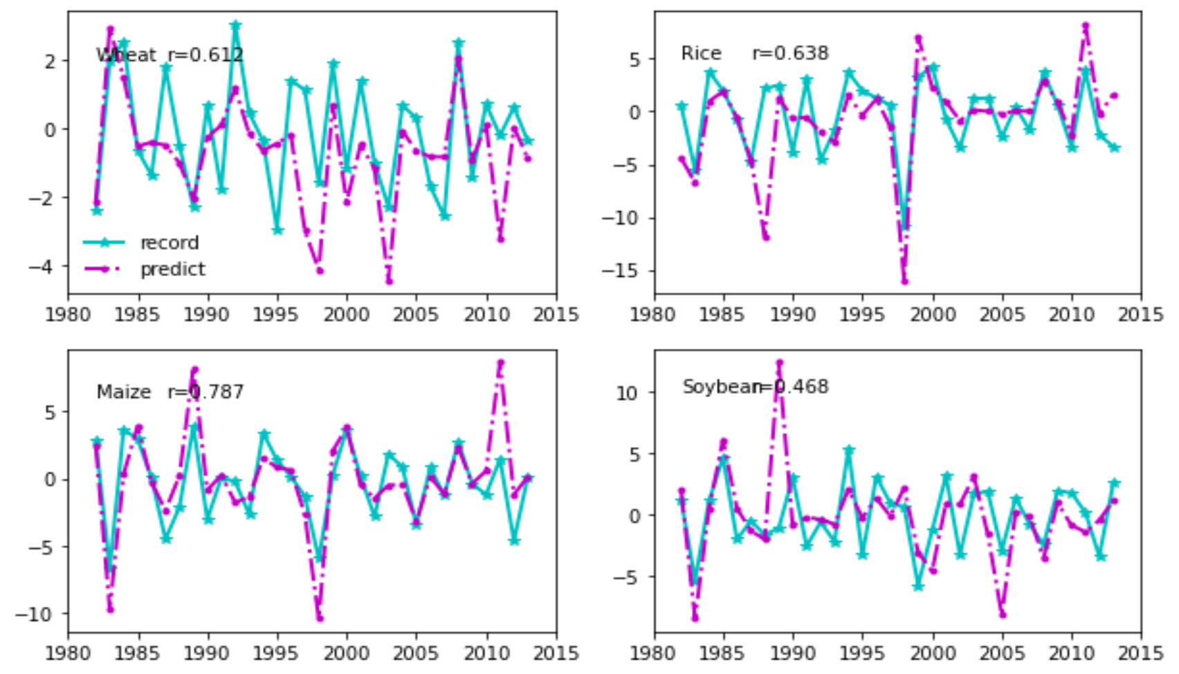 图3 四种主要作物的记录和预测之间全球平均年产量异常的时间序列对比
