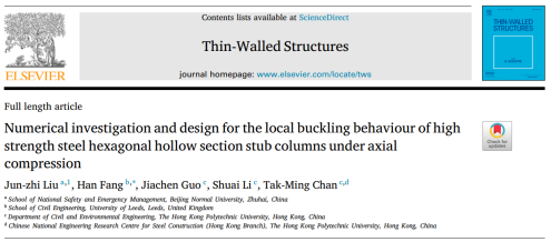 研究成果发表于土木工程/结构工程著名国际顶刊《Engineering Structures》(影响因子:5.5)和《Thin-Walled Structures》(影响因子:6.4)杂志分别发表了题为 “Structural behaviour of high strength steel hexagonal hollow section stub columns under axial compression”和 “Numerical investigation and design for the local buckling behaviour of high strength steel hexagonal hollow section stub columns under axial compression”的研究成果。刘俊志博士为论文第1作者,betway88西汉姆联为论文第一单位。以上工作受到bw必威西汉姆联人才引进项目、以及香港研究资助局RGC项目的共同资助。