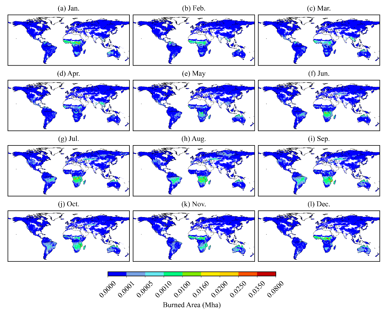 全球野火发生的空间预测模型:与基准分类器相比,CNN-2D模型预测的准确率最高(AUC = 0.86),网格单元的输入更能发挥CNN-2D空间特征提取的优势,CNN-2D能够充分利用邻域信息,具有较强的拟合和分类能力。全球敏感性评估结果反映了全球野火发生的季节性时空格局差异(如图1),北半球野火高峰主要集中在3-5和6-8月,然后随着干旱季从北向南逐渐移动,赤道以南的南美洲地区和赤道以南的非洲地区集中在6-8和9-11月,赤道以北的南美洲地区和赤道以北的非洲地区在12-2月达到峰值。