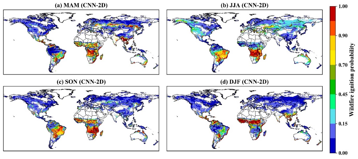 图. 1 全球野火发生的季节性空间预测结果(CNN-2D模型)